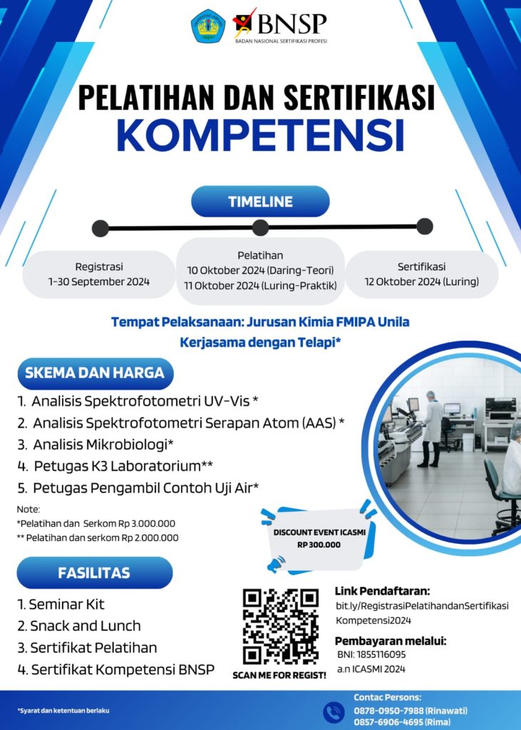 Dalam rangka meningkatkan kualitas dan kompetensi akademis serta profesional, panitia The 5th International Conference on Applied Sciences, Mathematics, and Informatics (ICASMI) berkolaborasi dengan LSP Telapi untuk menyelenggarakan program sertifikasi. Program ini dirancang khusus untuk para peserta yang ingin mendapatkan pengakuan atas keahlian dan keterampilan dalam bidang analisis kimia.